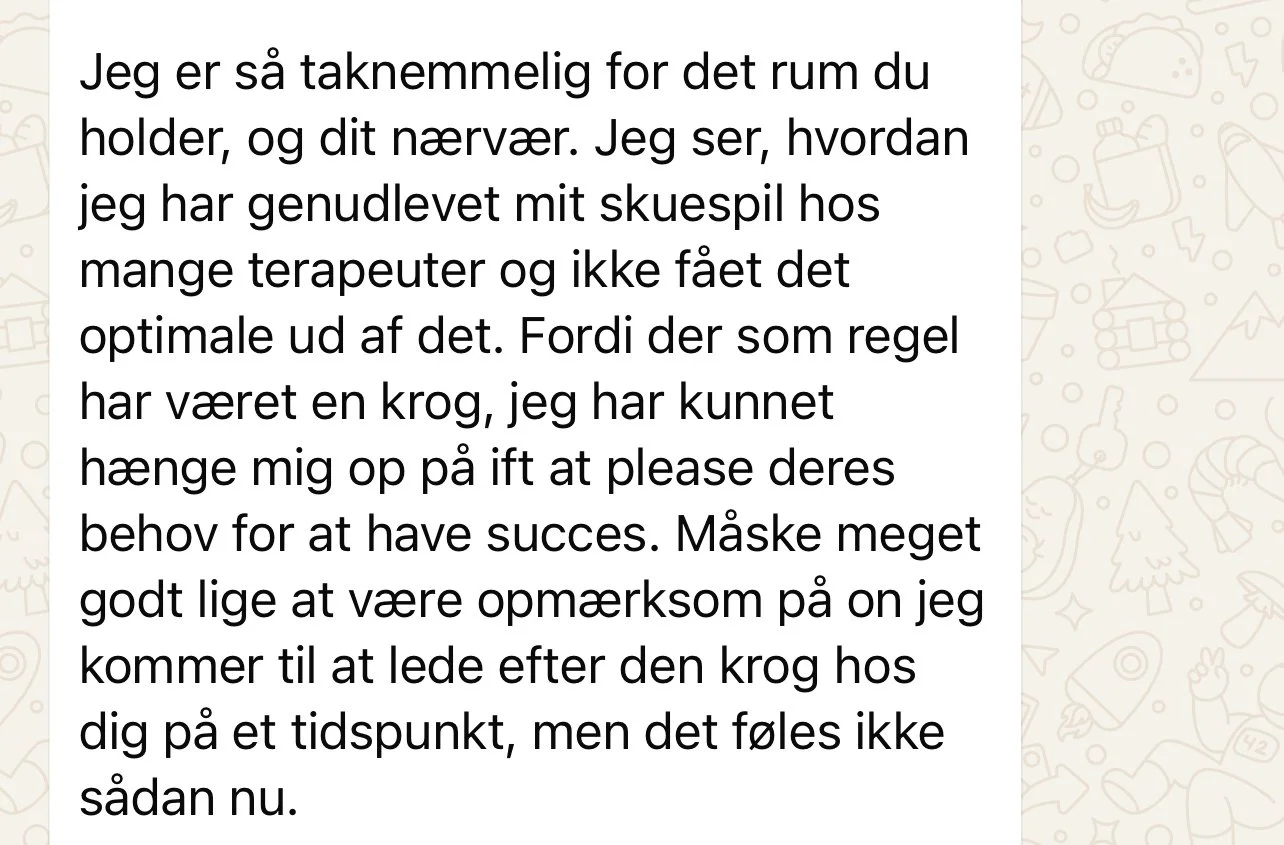Jeg har været igennem mange terapeutiske hænder igennem de sidste 30 år, og det er hos Luca Sofia at jeg har følt mig set og følt mig velkommen med alt det jeg bærer på - på en måde som hjælper mig på en måde jeg ikke har oplevet før.
